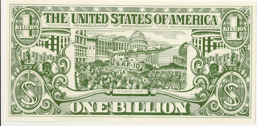 This was the hook. I knew the name Alice Cooper, but I associated him only with the songs I’d heard in the late ’80s, like “Poison” and “House Of Fire” (both pounded into mundanity by MTV). I knew he was classic rock, but–up until this point–I thought he was lame. I opened the wallet-design, gatefold jacket only to fall deeper. There were photos of the band on perforated card stock, so you could separate them if you wished. There was a giant billion dollar US currency note, with an illustration of a nuclear missile being rolled through Washington, DC, while onlookers cheered. I dubbed it to cassette and listened to that record–pops and all–for the rest of the Summer of ’91.