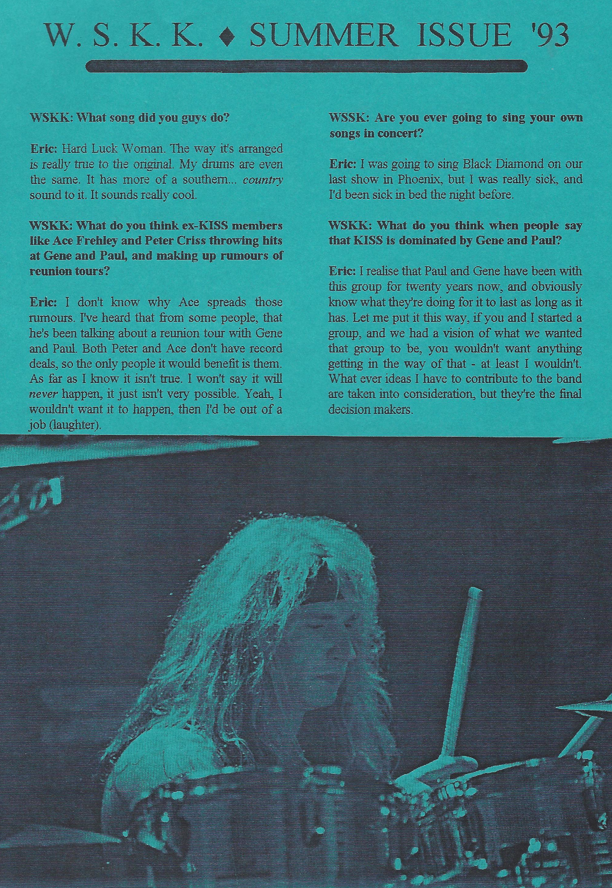 Gene made himself, Bruce and Eric accessible to ‘zine publishers. For reasons unknown to me, Paul wasn’t. In 1993 Brad gave me the opportunity to do a phone interview with Eric Singer to support the release of ALIVE III. Brad had informed me of the date and time that Eric Singer would call my house (well, my grandparent’s house). I set up a tape recorder and phone line cables to record the interview. I remember anxiously awaiting the call, staring at the beige plastic-desk-phone in my bedroom. The phone rang within a few minutes of the scheduled time, and I nervously answered. Being an interviewing novice (I’d only done one before, with Krist Novosellic of Nirvana), I prepared only a handful of questions for a scheduled 1 hour interview. Within 10 minutes of talking to Eric, I ran through all of them and things got awkward. I tried to come up with questions off the top of my head in uncomfortable silence, and then asked about Eric’s pay (more awkward). I was an 18 year old manic KISS fan who spent hours entombed in his room listening to their records. I was awkward incarnate.