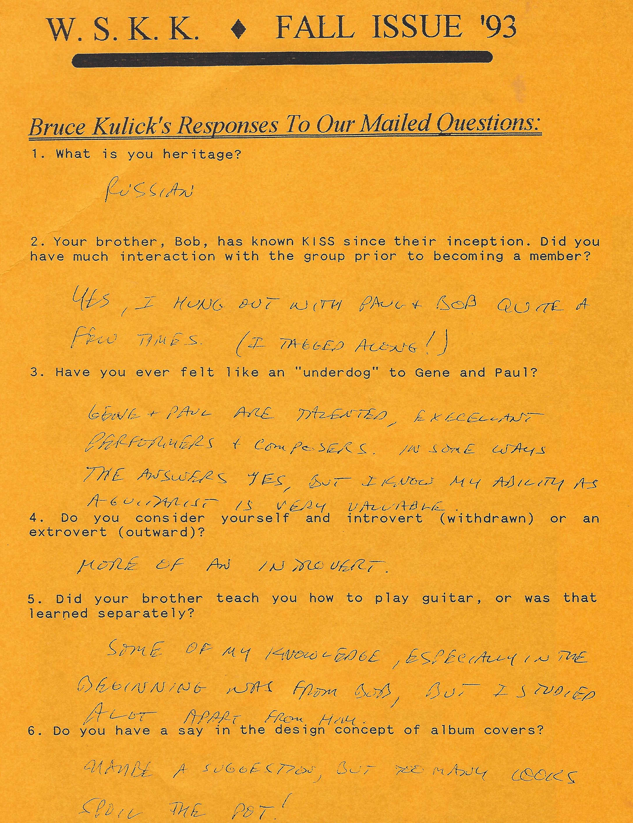 Later that year I had the chance to send in questionnaires to Gene and Bruce. I was limited to submitting a handful of questions on a sheet. I got them mailed back to me, with the answers filled in: