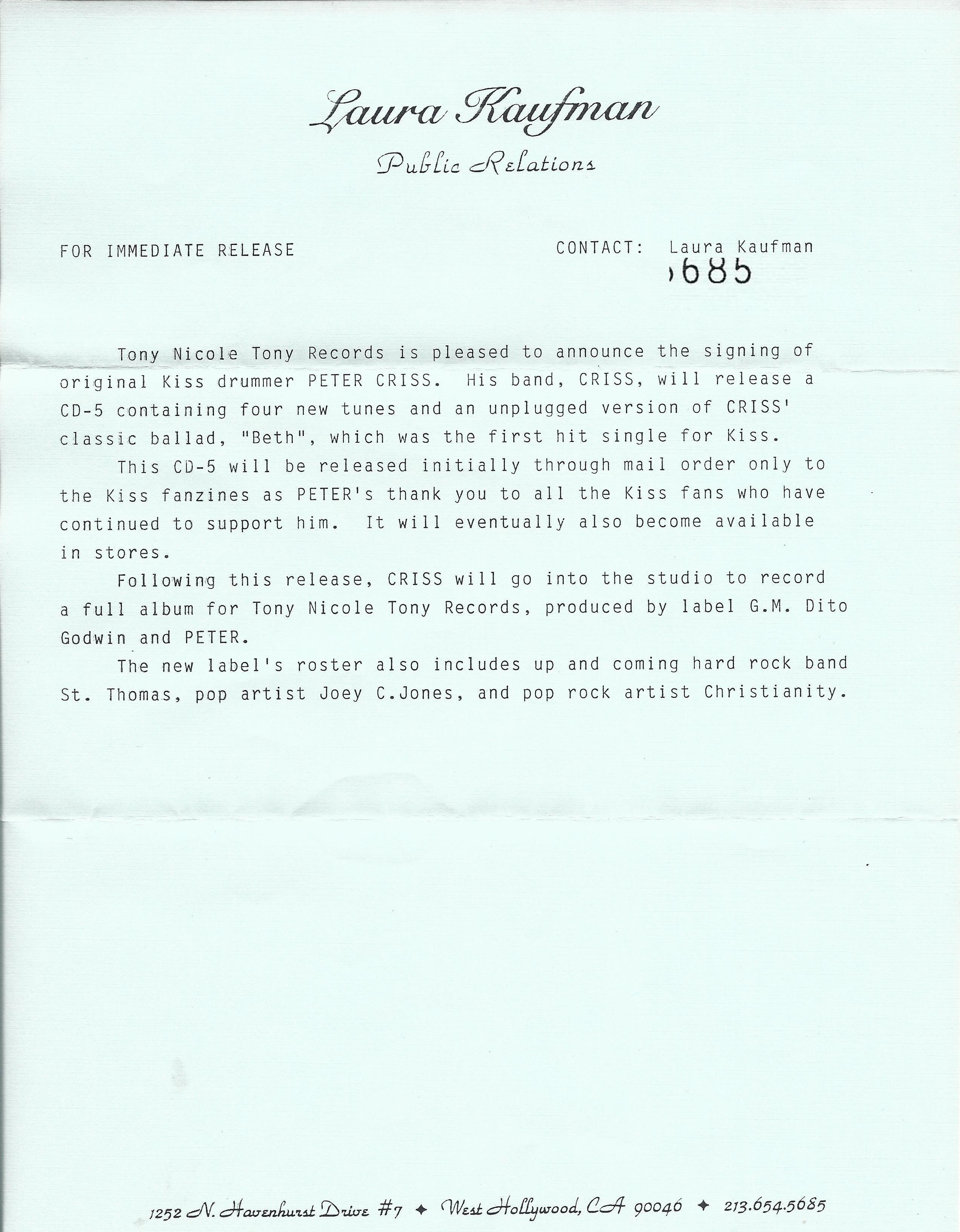 Near the end of 1993 I was getting correspondence from Peter Criss‘ then-publicist, Laura Kaufman. Peter was preparing to release a new CD EP entitled “CRISS” (with the S’s on his name stylized like the S’s in the KISS logo). Laura sent me out a copy of the disc. It was a sad affair. The first track on the disc was called “The Cat”. It was about how Peter wasn’t finished yet, and still had a solo career. The chorus went “The Cat’s got Nine Lives, He Do.” It also had a Jack and Jill nursery rhyme reference, with Gene and Paul replacing Jack and Jill. The guy’s career was down-and-out.