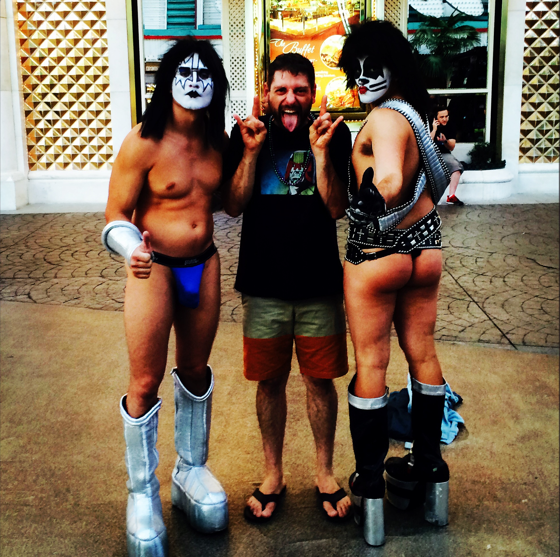 Street performers and costumed eccentrics were there, entertaining, and posing for photos. This ran the gamut of a duo who breakdanced to rap music blaring from their boombox, to another pair dressed up as Peter Criss and Ace Frehley of KISS, both in ass-exposing thongs. During our people watching we came across the exterior of a casino called simply “The D“. At one of the entrances was a cardboard standee, with an image of a hefty man in a power-suit, driving a sports car, with a beautiful blonde in the passenger seat. The copy above read “Win Derek’s Vette!”. I thought nothing of it until I walked into the casino, looked to my right, and saw the same guy sitting at the longest bar in Vegas (at least, according to The D). He was surrounded by a gaggle of men that appeared to work for him, smiling at everything he said, laughing at his jokes and basking in his aura. I immediately walked up to him and asked, “Are you the ‘Derek’ that’s pictured on the ad for ‘Win Derek’s Vette’ outside?”